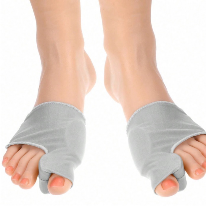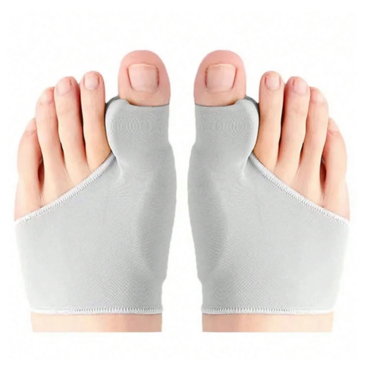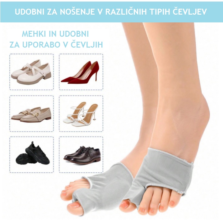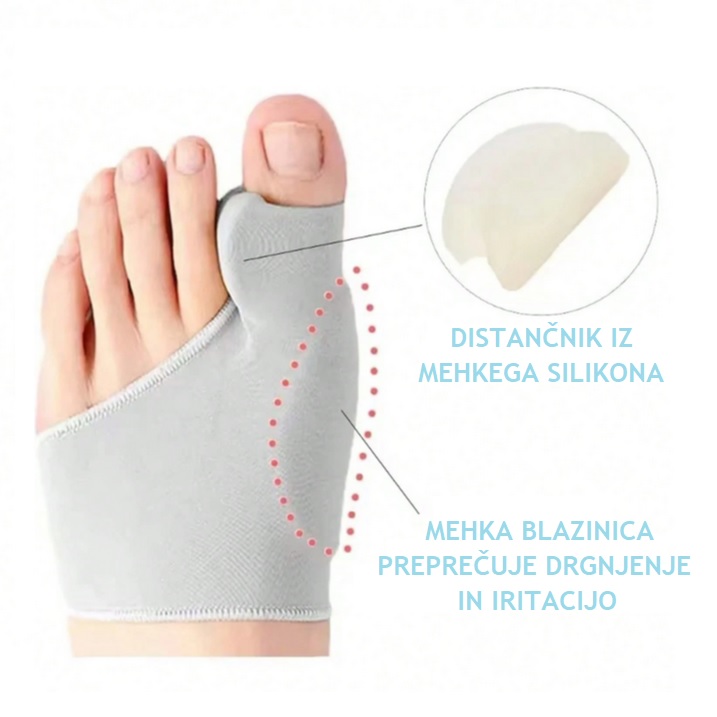 Dizajn v obliki lahkotne nogavice zagotavlja, da distančnik ostane na mestu ves dan — brez drsenja, brez neugodja. Gel vložek iz mehkega medicinskega silikona med palcem in kazalcem nežno loči prsta, zmanjšuje trenje in razbremenjuje sklepe. Tanka in prilagodljiva nogavica se prilega večini stopal in omogoča nošenje v zaprtih čevljih brez težav.